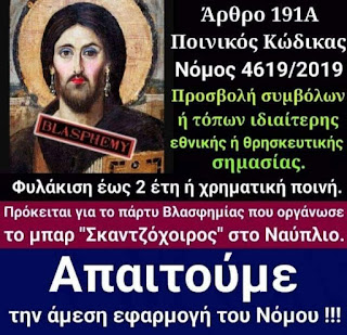 ΥΓ. Βλέπετε φίλοι μου για ποιον λόγο προσπαθούν οι άθεοι των ΝΔ και Συριζα να μην θεωρείται ποινικό αδίκημα η βλασφημία; (το ψήφισε ο Συριζα και μετά από πιέσεις των αθέων το άφησε και η ΝΔ.....)