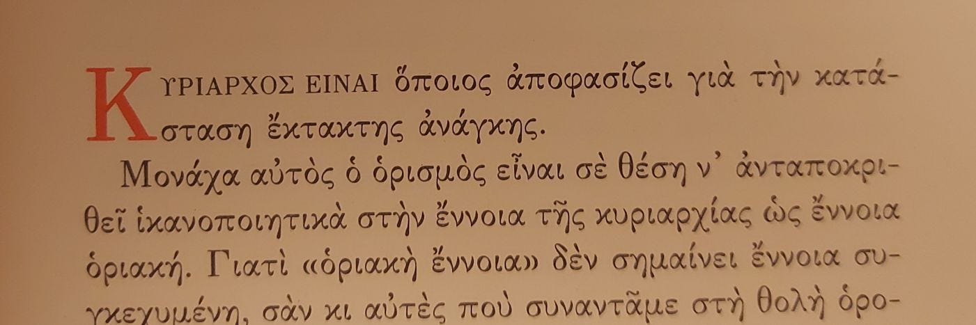«Κυρίαρχος είναι όποιος αποφασίζει για την κατάσταση έκτακτης ανάγκης» (“Souverän ist, wer über den Ausnahmezustand entscheidet”).